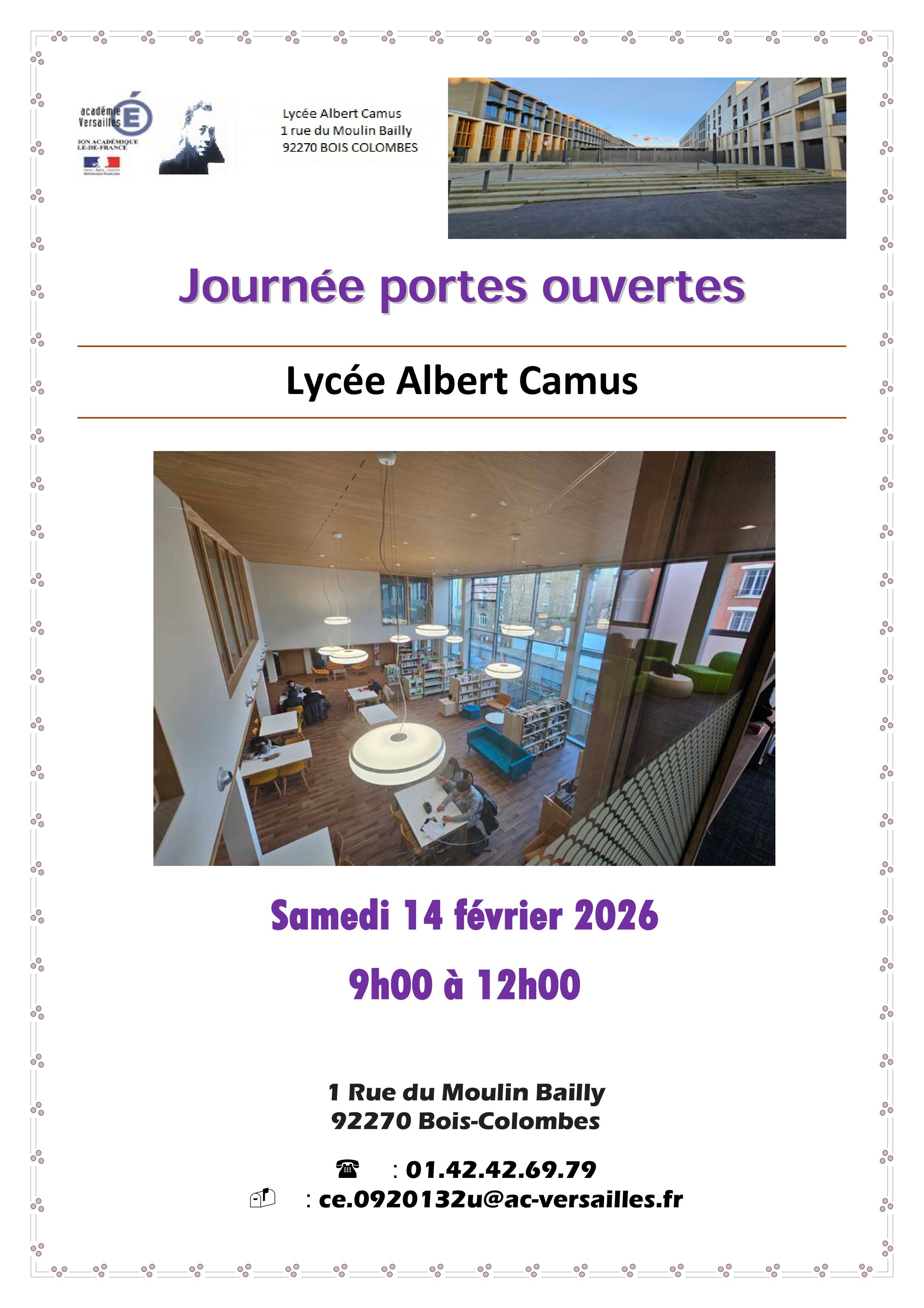 Venez découvrir le lycée Albert Camus, ses locaux, ses filières et spécialités à l’occasion de la Journée Portes Ouvertes organisée le samedi 14 février 2026 de 9h00 à 12h00.